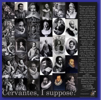 Muchos son los retratos "oficiales" de Cervantes, como podréis ver en la imagen que hemos compuesto para el póster de más arriba, pero ninguna certeza hay sobre cuál de ellos sea el auténtico o si existe siquiera uno que lo sea. Lo único que nos dejó Cervantes para mejor conocer su fisonomía y-una vez más- su fino humor, es esta descripción que de si mismo hace en el prólogo de sus Novelas Ejemplares, que ocupa el espacio en que debía haber un retrato del autor: